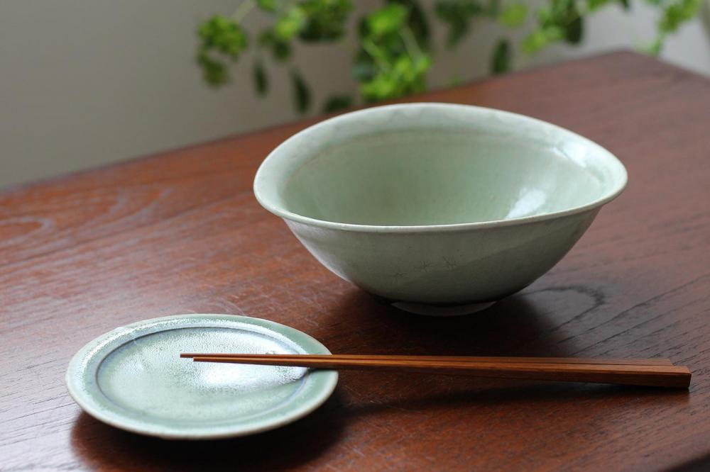 彩色灰釉は、淡く深みのあるグリーンに白っぽいところや青みがかったところがあり、色々な表情を見ることが出来ます。