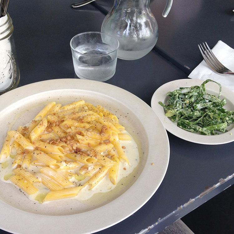 ランチでは、 チキンレムラード&スパイスピクルス、ルッコラのグルテンフリーパンケーキ。 ペンネ モッツァレラ&ゴルゴンゾーラのソース、ケールシーザーサラダを頂きました。