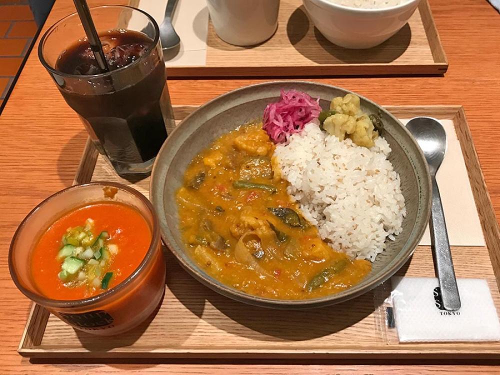 写真下は、玉葱と鶏肉のカレーとトマトと夏野菜のガスパッチョのカレーセット。