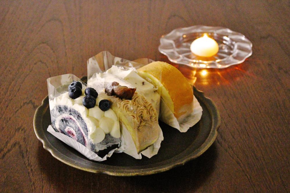 この日は、米粉のロールケーキ4種類をテクアウト。 左から、ブルーベリーチーズ、くり、チョコチップ、はらロールです。 原とうふ店さんの豆乳が使われていて、口当たりも軽く、甘さ控えめで美味しいです。