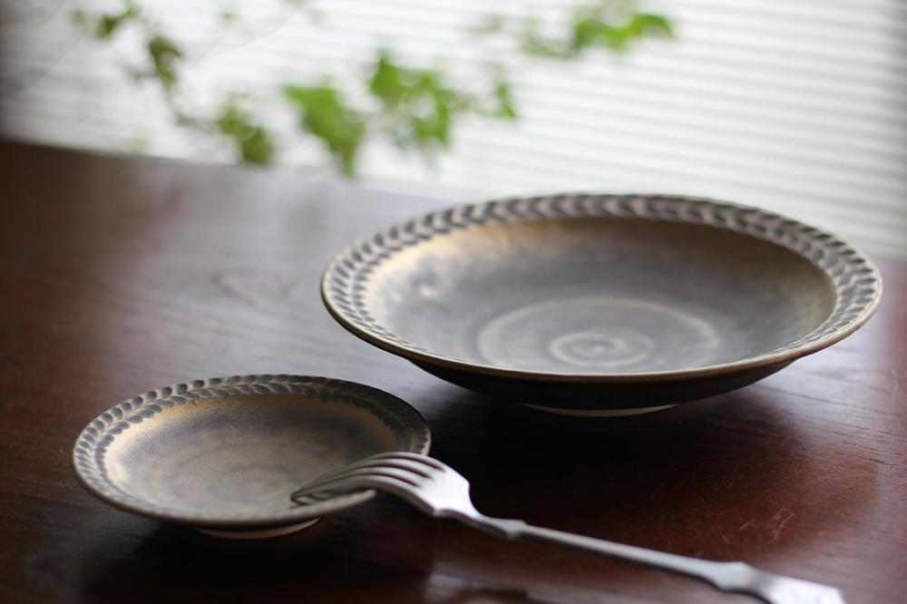 市野耕さんのマンガン釉の葉紋皿