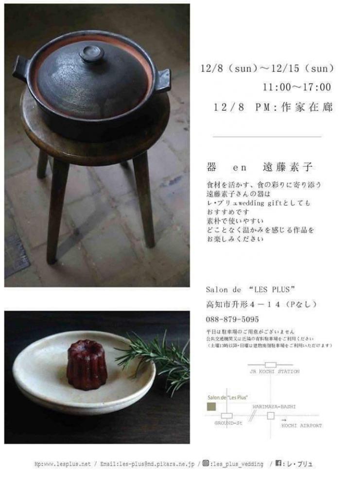 器en 遠藤素子さんの個展が、12月8日(日)より高知のsalon de LES PLUSで開催されます。 食材を活かす、食の彩に寄り添う遠藤素子さんの器は、ギフトにもおすすめです。 素朴で使いやすい どことなく温かみを感じる作品をお楽しみください。 土鍋やグラタン皿など冬に大活躍する器も並びます。 初日の12/8は作家在廊です。 お近くの方は是非、お出掛けください。